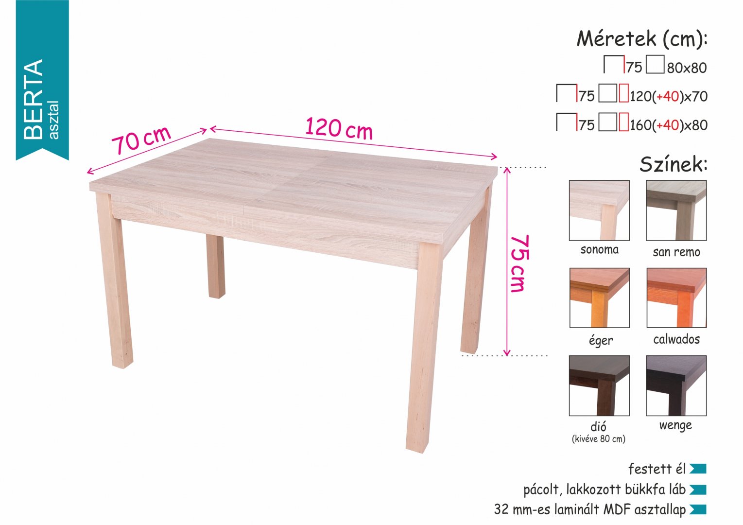 Masszív, kedvező árú étkezőasztal, 6-ról 8 személyesre bővíthető.8 színben rendelhető, 4-6 hét alatt beszerezzük. Kiállító termünkben ki van állítva, megnézhető, színminták alapján kiválaszthatja az Önnek tetsző árnyalatot.Az aktuális raktárkészletért kérjük telefonáljon.