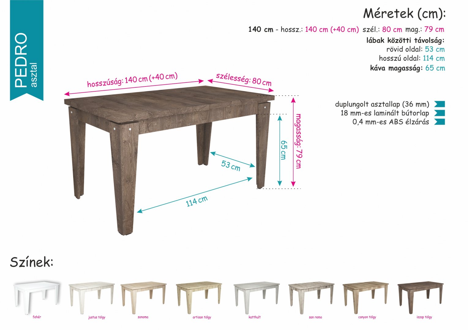 Masszív, kedvező árú étkezőasztal, 6-ról 8 személyesre bővíthető. 8 színben rendelhető, 4-6 hét alatt beszerezzük. Kiállító termünkben ki van állítva, megnézhető, színminták alapján kiválaszthatja az Önnek tetsző árnyalatot.Az aktuális raktárkészletért kérjük telefonáljon.