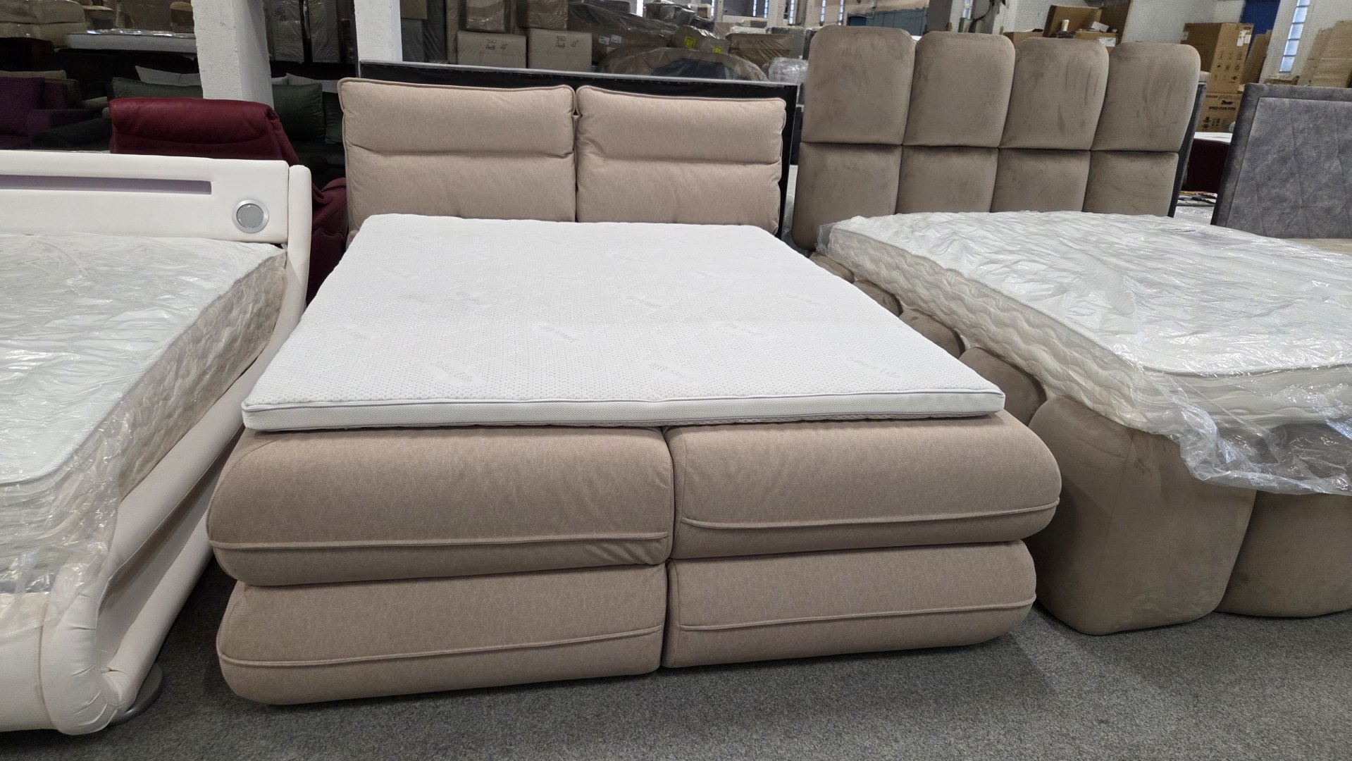 Modern franciaágy magas szuperpuha párnás háttámlával (ami levehető), ezüstszálas, antibakteriális fekvőfelülettel, és egy szuperkényelmes memóriahabos fedőmatraccal. A huzata levehető és mosható. Fekvővelülete hullámrugó és bonellrugós, ágyneműtartója pillangónyitású.