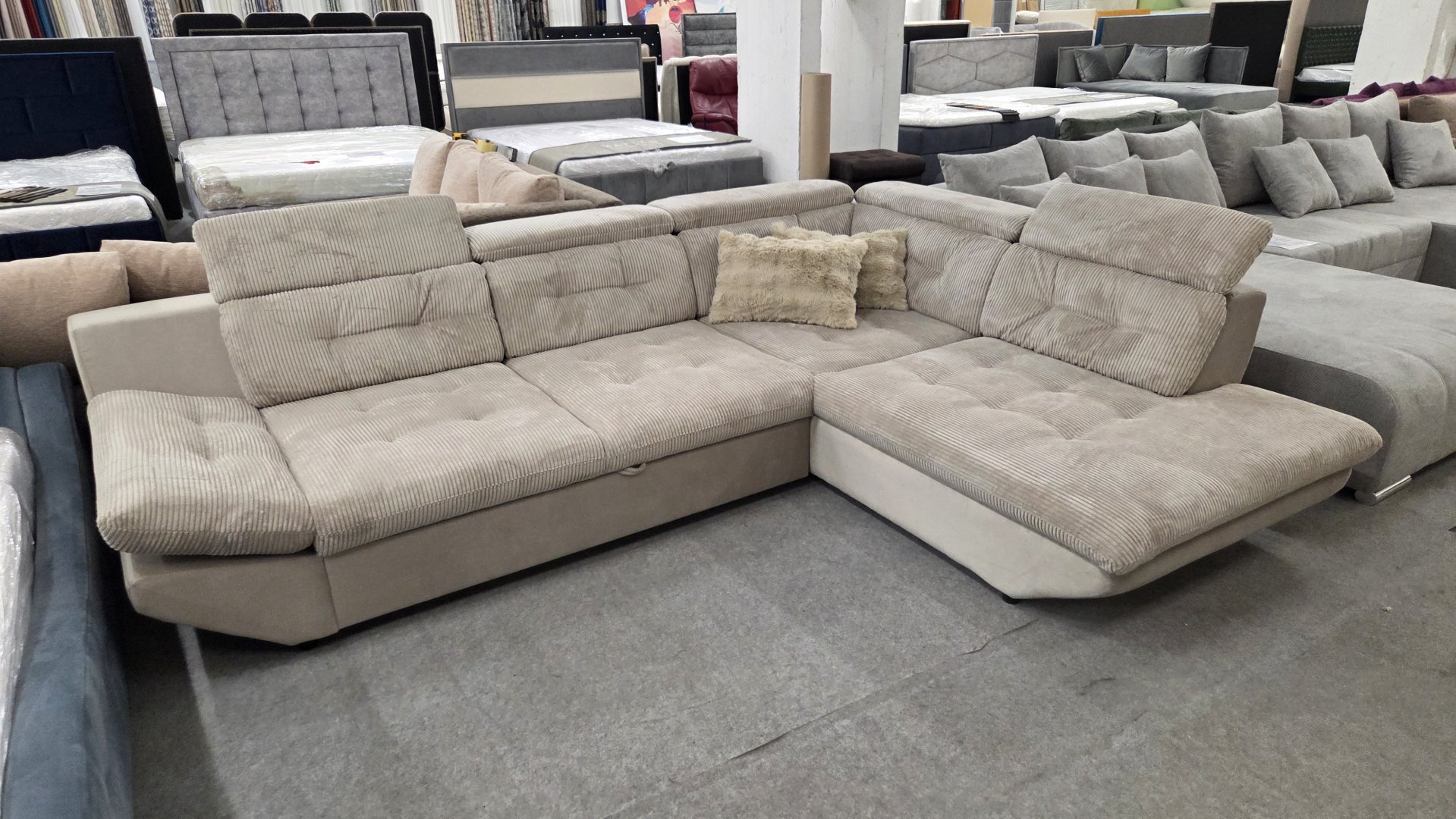 Akciós német egyedi darabos bútor, nem rendelhető, a képen látható termék vásárolható meg. Kiváló minőségű kanapé, könnyen tisztítható kárpittal, vendégágy funkcióval.Felül kordbársony szürke szövet, alul és hátul zsákszövet kombinációban.