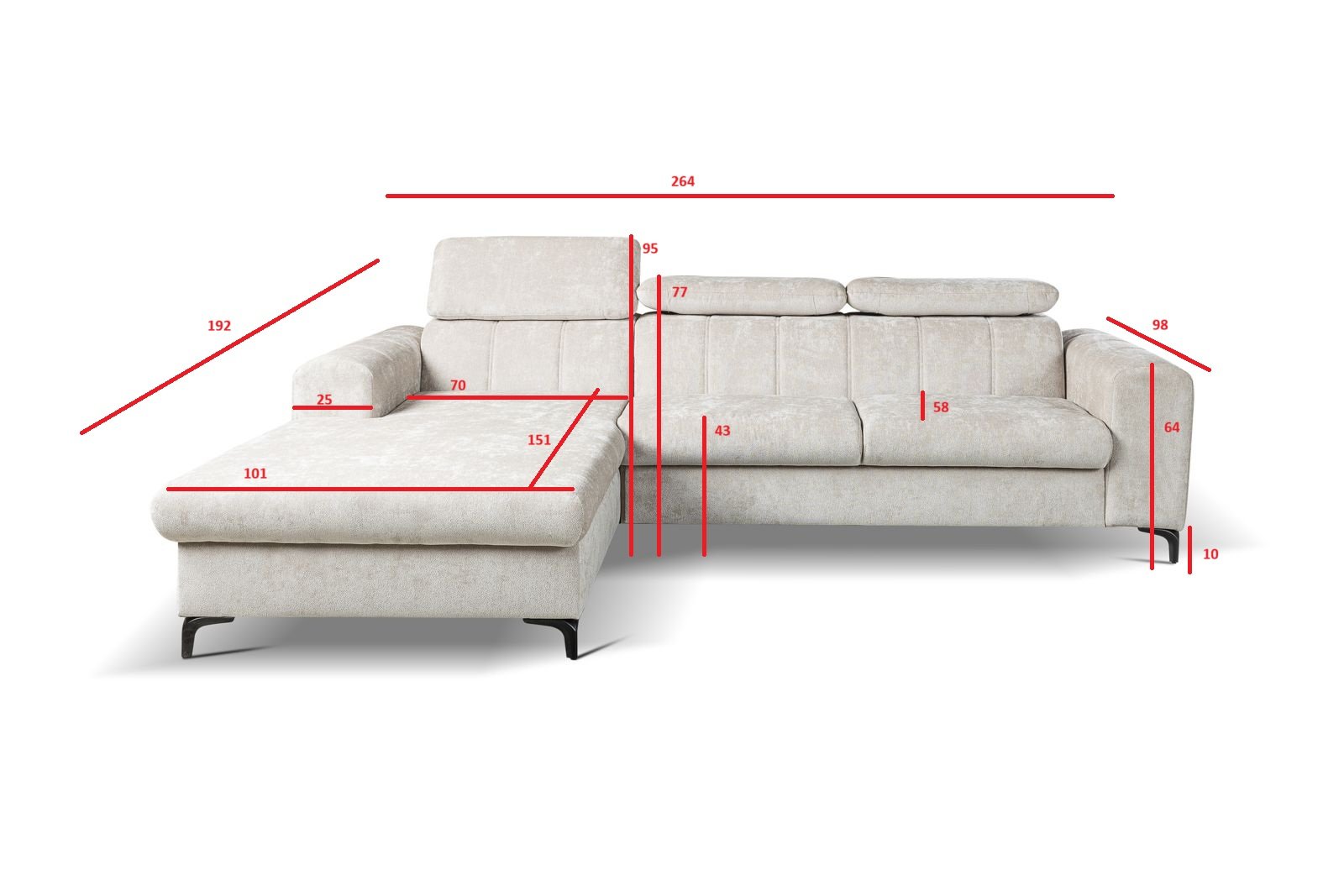 A Kanapé magassága: 76-98cm le és felhajtott fejtámlávalÜlőmagasság: 45cmÜlőmélység: 58cmÜlőfelülete hullámrugó+ hideghab kombinációja