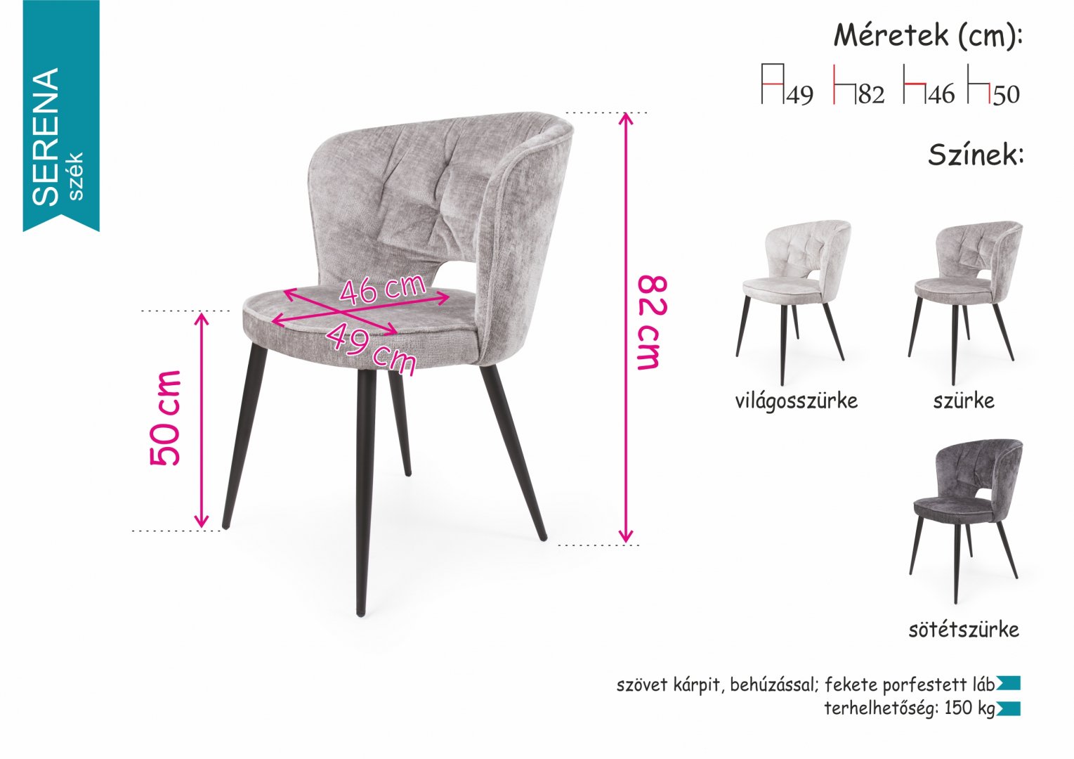Kényelmes karfás kárpitozott étkezőszék három féle szürke színben kapható. Elegáns ebédlő elengedhetetlen tartozéka! Az aktuális raktárkészletért kérjük telefonáljon.