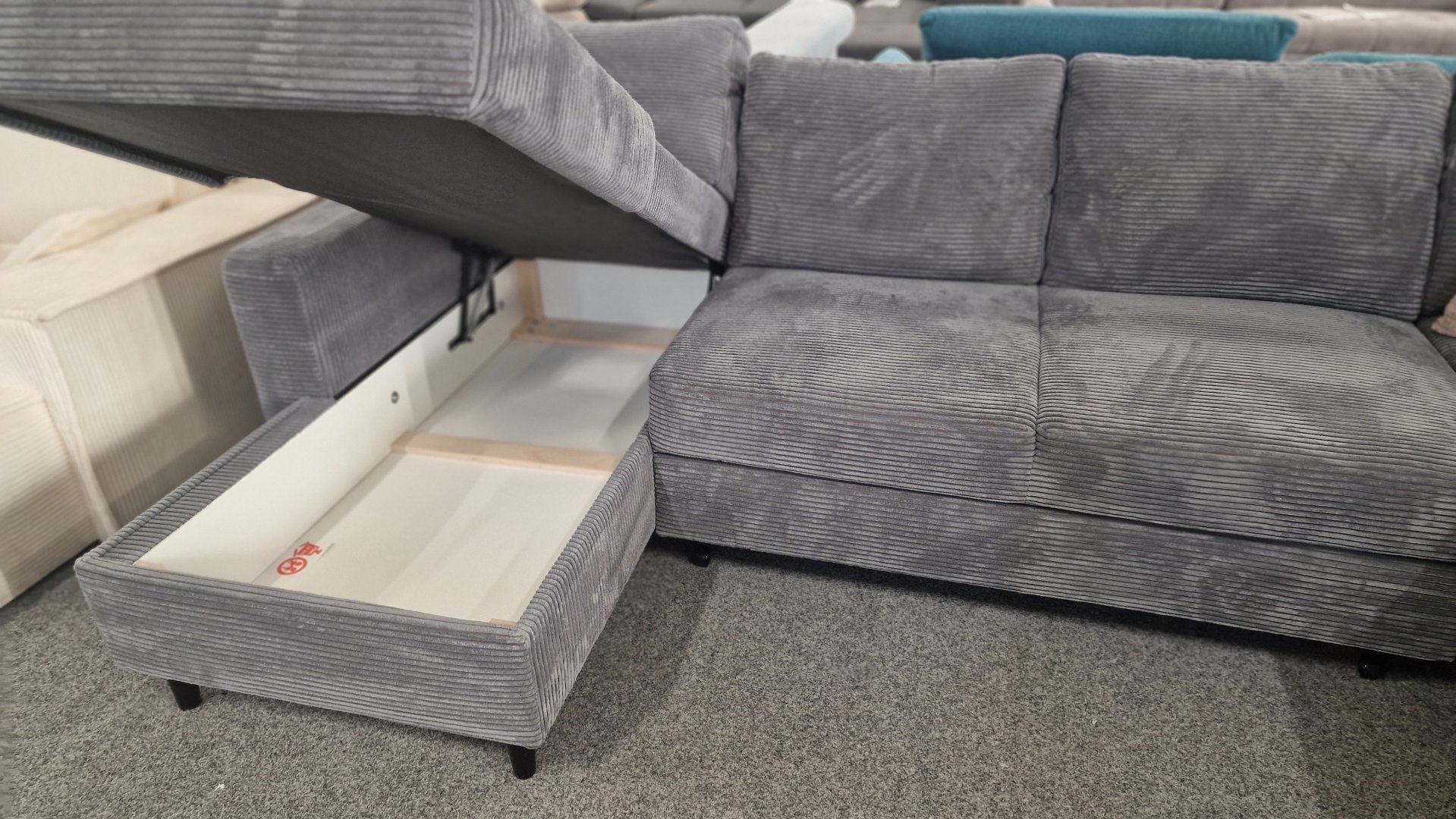 Német piacra gyártott, kiváló minőségű kanapé. Ágyazható, ágyneműtartós, kordbársony szövettel.
